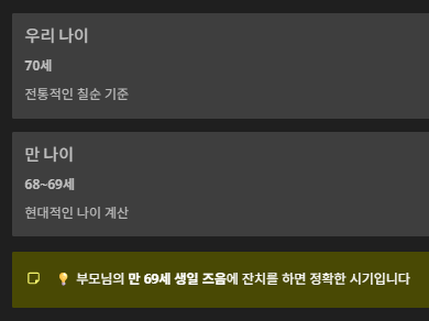 즉, “우리 나이 70세 = 만 69세 무렵”이라고 이해하면 됩니다.