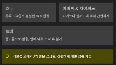 | 들기름 | 약 9,000mg | ALA | 비가열 요리에 |