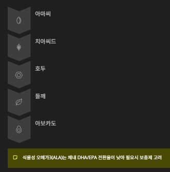 다만 식물성 오메가3(ALA)는 체내에서 DHA와 EPA로 전환되는 비율이 낮기 때문에, 필요에 따라 보충제를 함께 고려하는 것이 좋습니다.