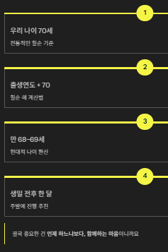 즉, “우리 나이 70세 = 만 69세 무렵”이라고 이해하면 됩니다.