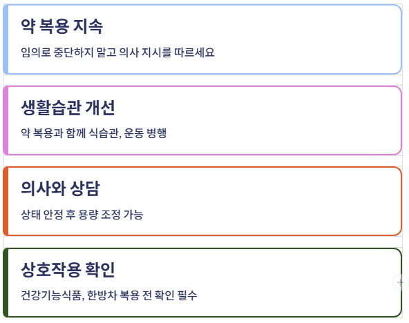 생활습관을 개선하면서도 의사 지시에 따라 약을 꾸준히 복용해야 하며, 일정 기간이 지난 후 상태가 안정되면 의사와 상담해 용량을 조정할 수 있습니다.